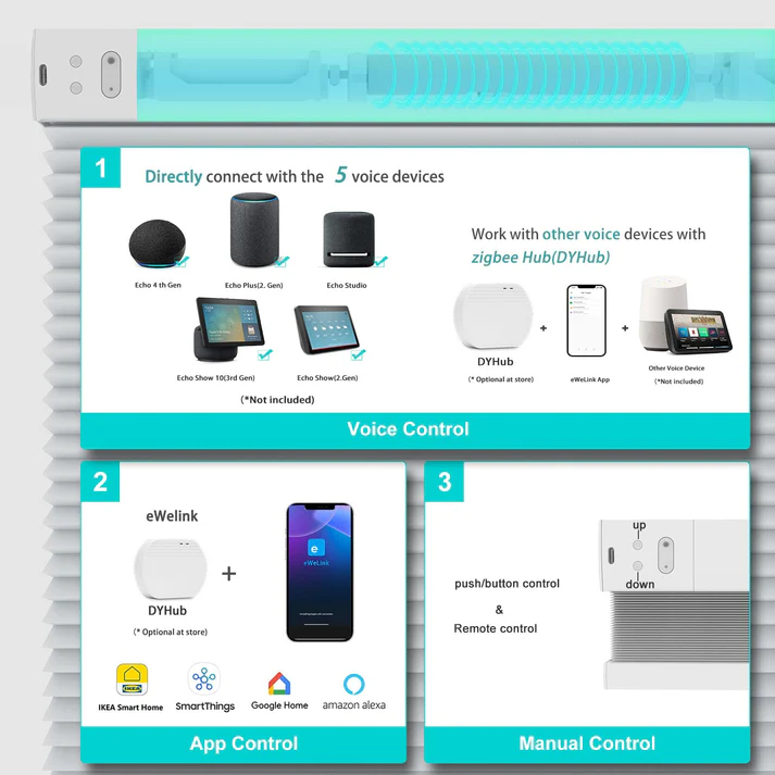 SOUND & HEAT INSULATION: Customized motorized blinds are built-in smart battery motors, unique honeycomb construction offers sound absorption, so as to provide you with a comfortable space. Provide shading and heat insulation effects, while also protecting you and your family from ultraviolet rays. Smart blinds also work well in noise reduction and privacy protection.